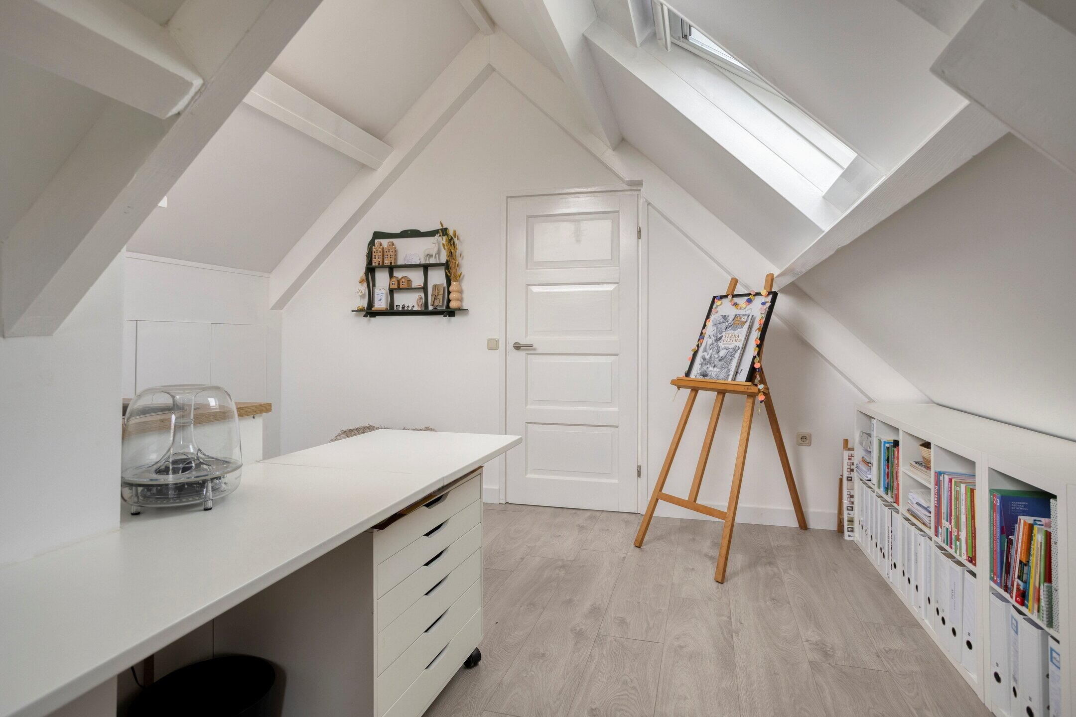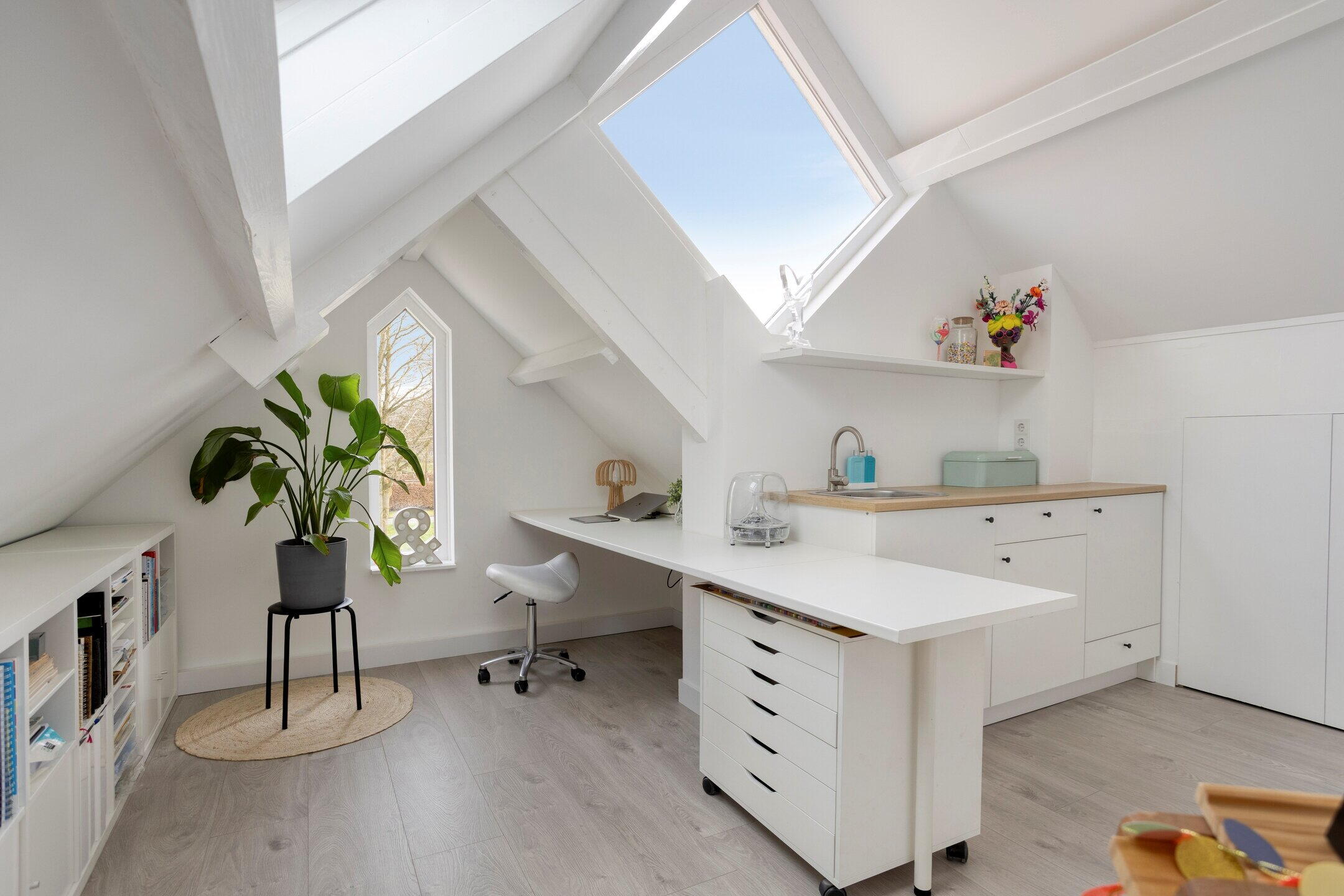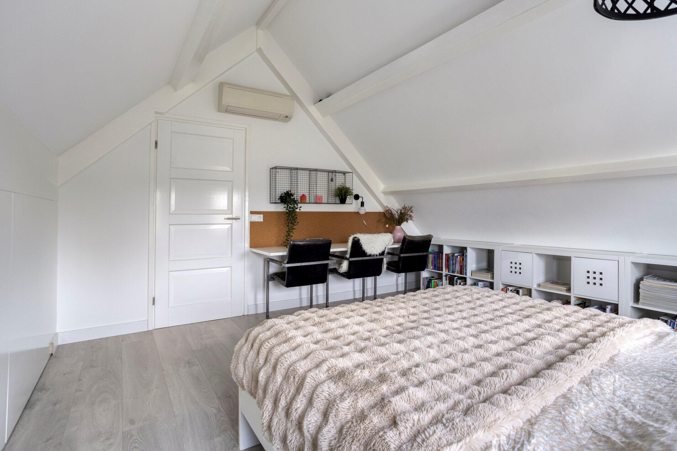 Overloop met bergruimte en dakraam, een werk/slaapkamer met keukenblok en spoelbak en mechanische ventilatie-unit en een ruime slaapkamer met airco. Alle ruimten zijn voorzien van wandverwarming.