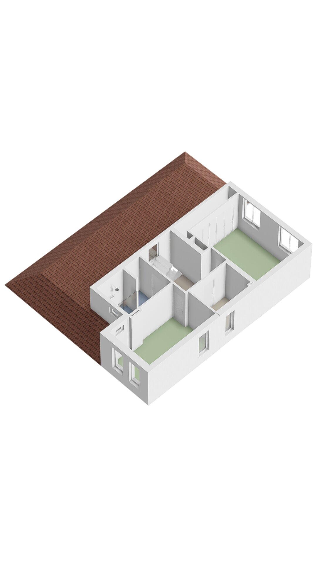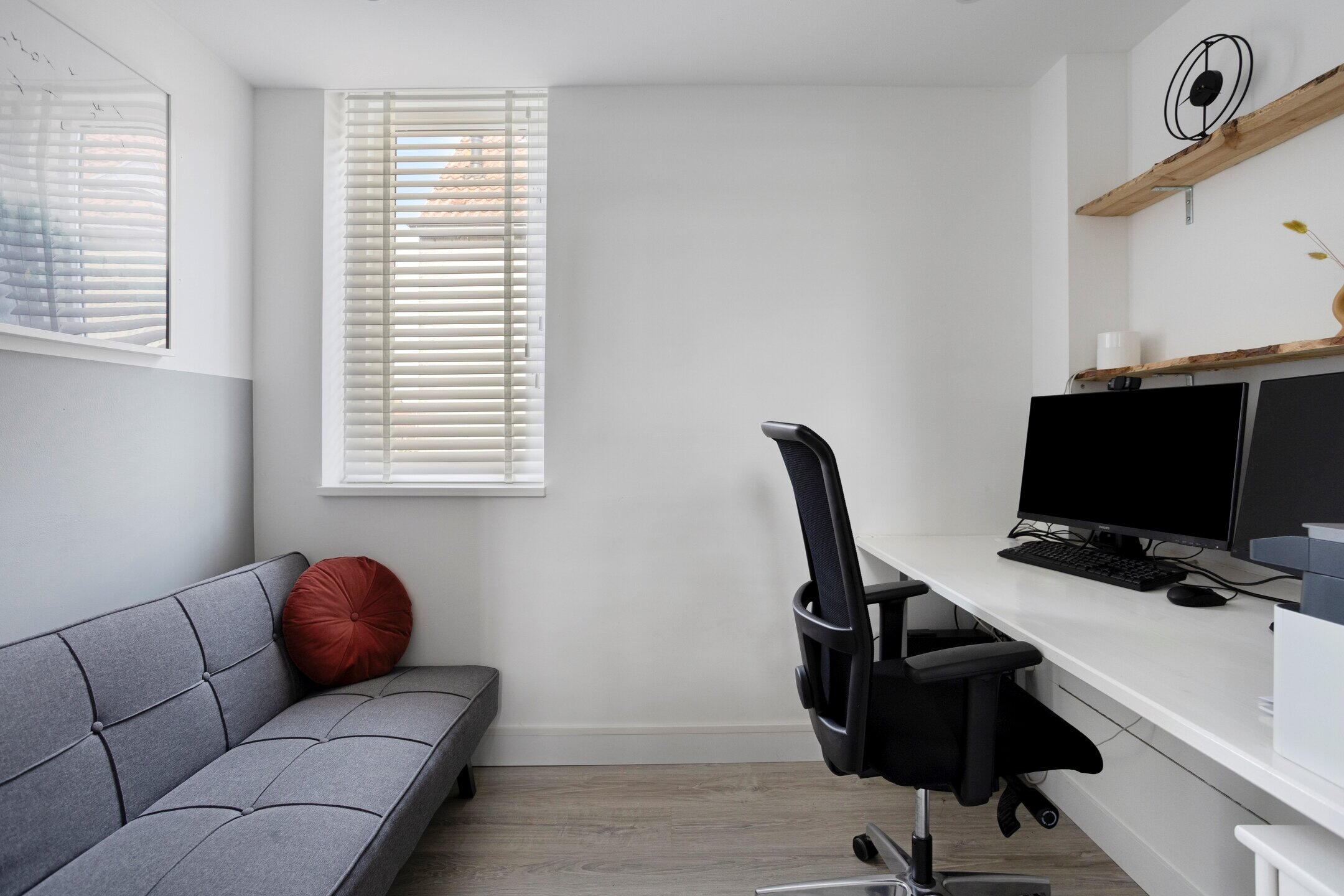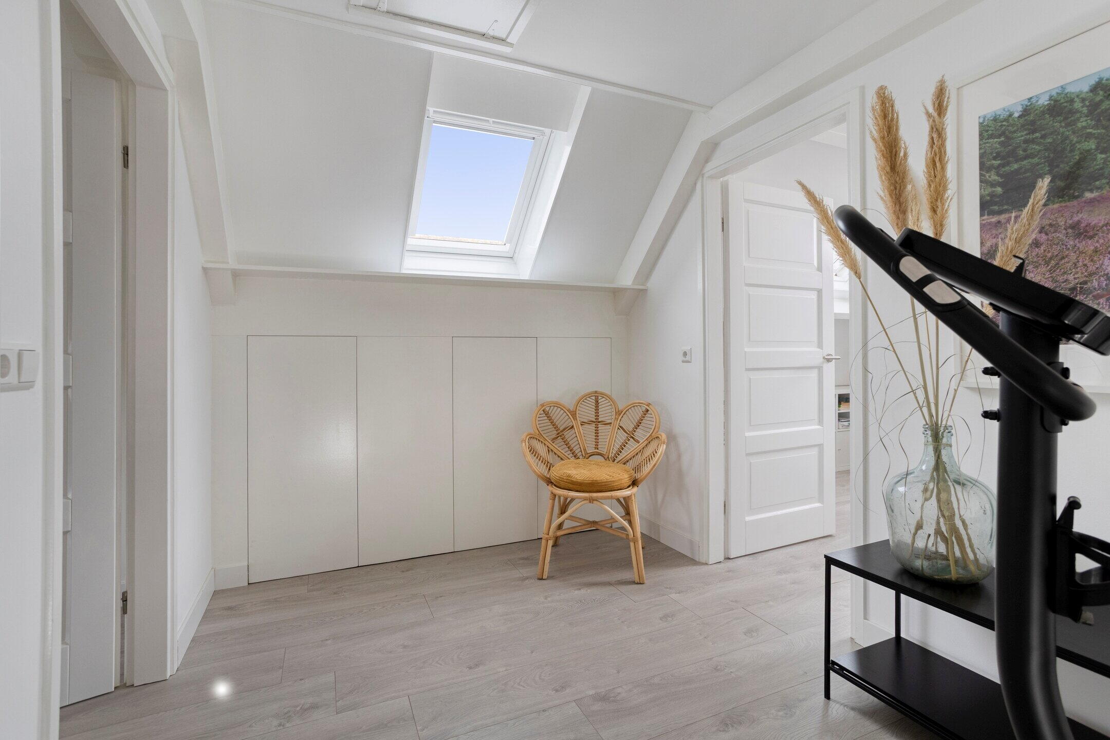 Overloop met bergruimte en dakraam, een werk/slaapkamer met keukenblok en spoelbak en mechanische ventilatie-unit en een ruime slaapkamer met airco. Alle ruimten zijn voorzien van wandverwarming.