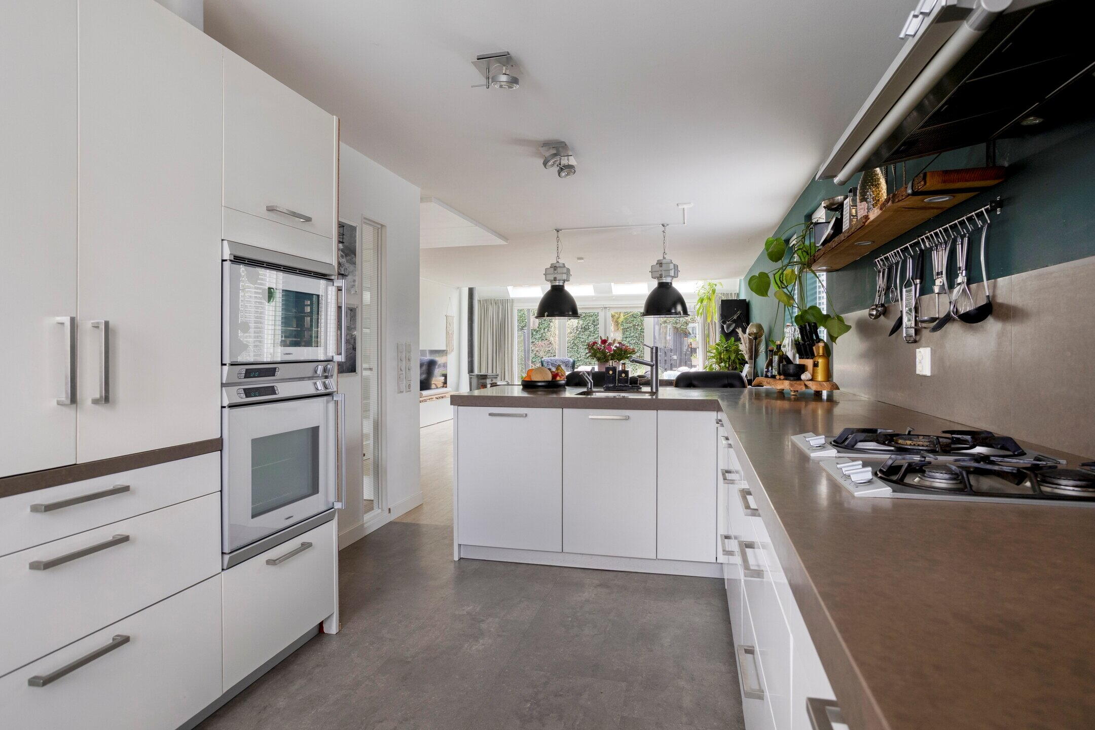 Overdekte entree, hal met meterkast, toiletruimte met wandtoilet en fonteintje, (eventueel deur naar woning Vossebes 2). Grote woonkamer met veel lichtinval door vier extra dakramen aan de achterzijde en openslaande deuren naar de achtertuin, houtkachel en deur naar garage/berging, deze is verlengd tot ruim negen meter, hier treft u nog een klein keukenblok en de opstelling van cv-ketel, warmtepomp en de thuis batterij van 46kw. Aan de voorzijde van de woning ligt de ruime leef keuken met grote kastenwand met inbouwapparatuur en een groot in L-vorm opgesteld keukenblok met kasten en laden in het wit uitgevoerd met aanrechtblad van composiet en een eetbar. De keuken is voorzien van diverse Gaggenau apparatuur te weten: 2 pits gaskookplaat en een wokbander, afzuigkap, hetelucht oven en combi-stoomoven. Verder zijn er nog een koelkast en een vaatwasser, een close-in boiler en Quooker ingebouwd. De gehele beneden verdieping is voorzien van een PVC vloer met vloerverwarming.